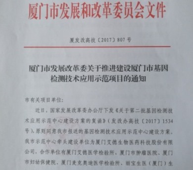 近日,廈門市發(fā)展和改革委員會(huì)發(fā)布《廈門市發(fā)展改革委關(guān)于推進(jìn)建設(shè)廈門市基因檢測(cè)技術(shù)應(yīng)用示范項(xiàng)目的通知》(廈發(fā)改高技[2017]807號(hào)),正式批復(fù)由廈門艾德生物醫(yī)藥科技股份有限公司牽頭建設(shè),廈門艾德醫(yī)學(xué)檢驗(yàn)所、廈門市腫瘤醫(yī)院、廈門市婦幼保健院等合作共建【廈門市基因檢測(cè)技術(shù)應(yīng)用示范項(xiàng)目】。
