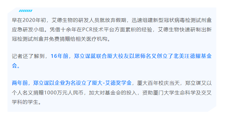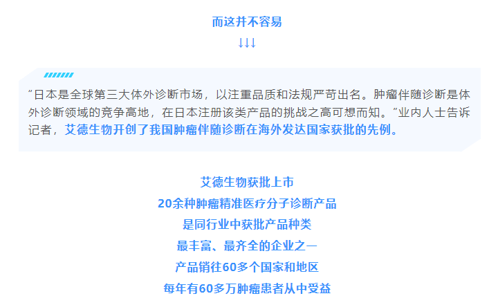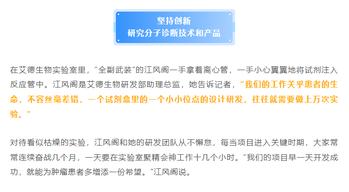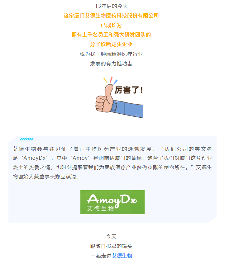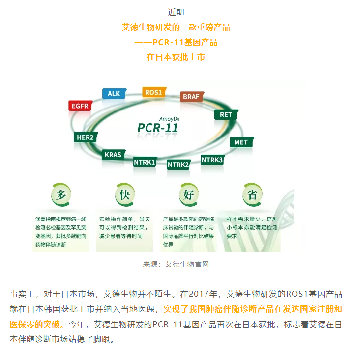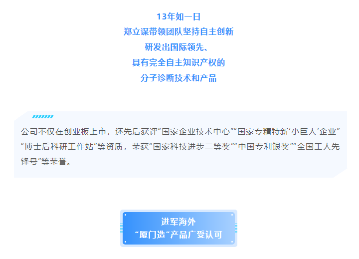 廈門艾德生物醫(yī)藥科技股份有限公司(股票代碼:300685)聚焦在腫瘤精準(zhǔn)醫(yī)療分子診斷領(lǐng)域,專注于科技惠民的技術(shù)創(chuàng)新,致力為患者提供合規(guī)、高品質(zhì)的診斷產(chǎn)品和服務(wù),讓患者從精準(zhǔn)醫(yī)療中真正獲益。公司擁有國(guó)家企業(yè)技術(shù)中心、工信部專精特新小巨人企業(yè)、國(guó)家級(jí)制造業(yè)單項(xiàng)冠軍企業(yè)、博士后科研工作站、發(fā)改委基因檢測(cè)技術(shù)應(yīng)用示范中心、國(guó)家高新技術(shù)企業(yè)、福建省腫瘤高通量測(cè)序工程研究中心等資質(zhì),GMP標(biāo)準(zhǔn)廠房獲得國(guó)家藥監(jiān)局(NMPA)和歐盟ISO13485資質(zhì)認(rèn)證;公司擁有ADx-ARMS?、Super-ARMS?、ddCapture?、ADx-HANDLE?等核心技術(shù),核心技術(shù)獲得中國(guó)、美國(guó)、歐盟、日本授權(quán),榮獲國(guó)家科學(xué)技術(shù)進(jìn)步獎(jiǎng)二等獎(jiǎng)、中國(guó)專利獎(jiǎng)銀獎(jiǎng);公司產(chǎn)品覆蓋具備精準(zhǔn)醫(yī)療條件的各大癌種,多個(gè)產(chǎn)品至今尚無(wú)競(jìng)品,除了在國(guó)內(nèi)三甲醫(yī)院大規(guī)模應(yīng)用外,部分產(chǎn)品在日本、韓國(guó)獲批上市并進(jìn)入當(dāng)?shù)蒯t(yī)保,開(kāi)創(chuàng)了我國(guó)腫瘤伴隨診斷海外獲批的先例。此外,公司下設(shè)廈門艾德醫(yī)學(xué)檢驗(yàn)所、上海廈維醫(yī)學(xué)檢驗(yàn)所,擁有醫(yī)療機(jī)構(gòu)執(zhí)業(yè)許可證、通過(guò)美國(guó)病理學(xué)會(huì)(CAP)認(rèn)證和ISO15189認(rèn)可,專業(yè)從事第三方臨檢服務(wù)。目前全球數(shù)十個(gè)國(guó)家和地區(qū)的客戶選擇了艾德產(chǎn)品和服務(wù),每年有數(shù)十萬(wàn)腫瘤患者從中受益。此外,公司瞄準(zhǔn)行業(yè)創(chuàng)新源頭,以伴隨診斷賦能原研藥物臨床,是眾多頂級(jí)藥企腫瘤藥物開(kāi)發(fā)的戰(zhàn)略合作伙伴,是國(guó)際知名的民族品牌。