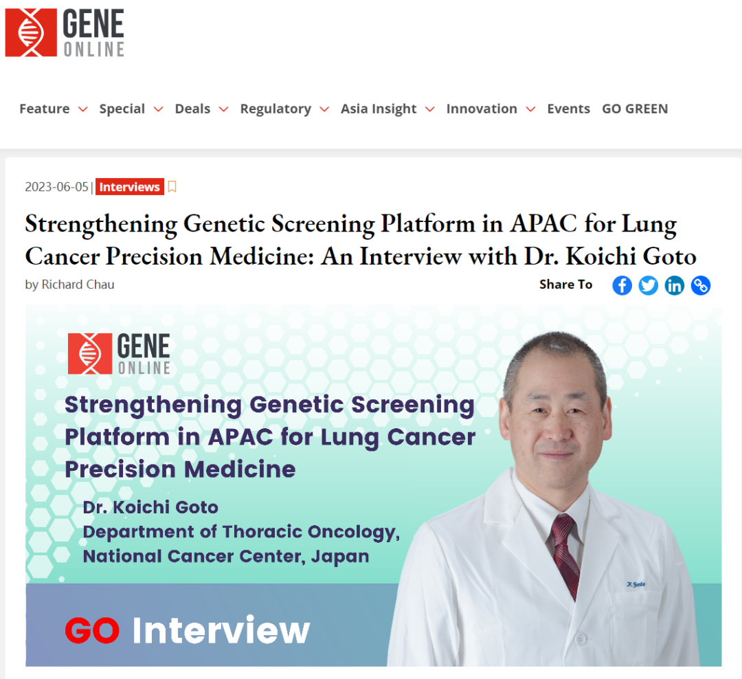 6月5日,國(guó)際頂尖肺癌專家、亞洲肺癌基因組篩查項(xiàng)目(LC-SCRUM-Asia,由日本國(guó)家癌癥研究中心發(fā)起,日本200多家醫(yī)院及制藥、診斷企業(yè)共同參與的LC-SCRUM-Asia癌癥靶標(biāo)篩查項(xiàng)目)負(fù)責(zé)人Koichi Goto教授,在接受國(guó)際行業(yè)權(quán)威媒體GeneOnline采訪中強(qiáng)調(diào):