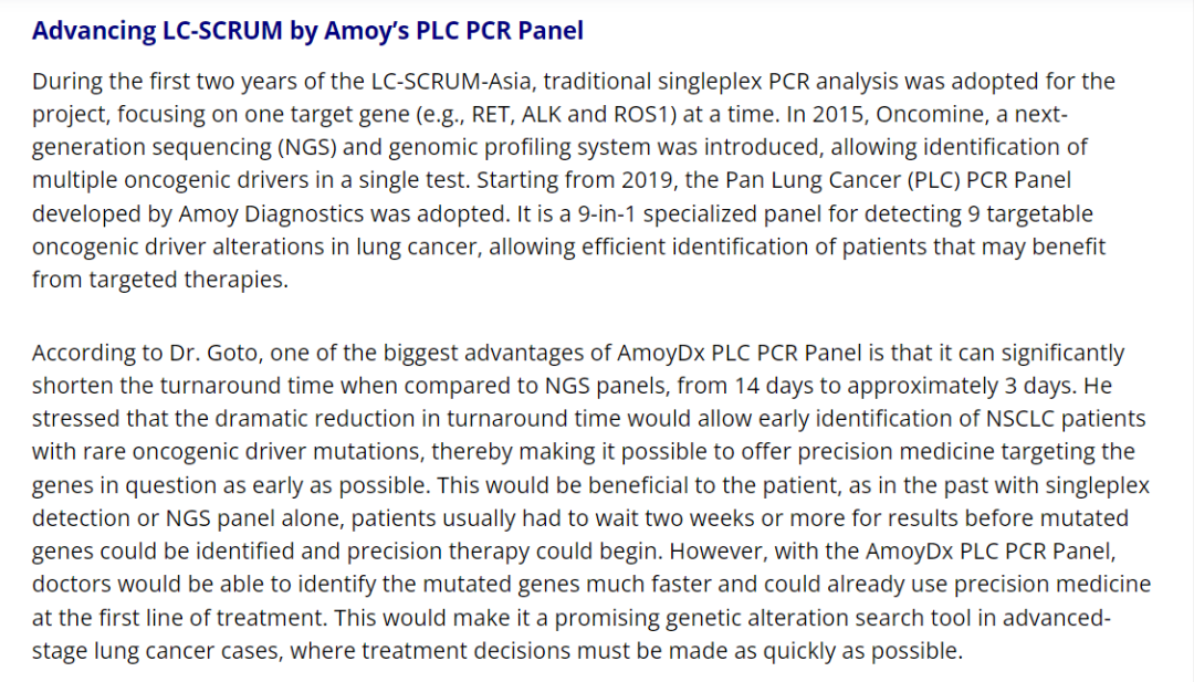 “與NGS方法相比,艾德生物PCR-11基因最大的優(yōu)勢(shì)是,可以將檢測(cè)周期從NGS產(chǎn)品的14天縮短到僅需3天。他強(qiáng)調(diào),這種檢測(cè)周期的大幅縮短令人矚目,將使攜帶罕見突變的非小細(xì)胞肺癌患者盡早接受治療。相比NGS檢測(cè),患者通常需要等待兩周或更長(zhǎng)時(shí)間才能獲得基因突變的檢測(cè)結(jié)果,之后再實(shí)施個(gè)性化治療。使用艾德生物PCR-11基因,醫(yī)生可以更快地確定這些基因突變,并在病情較輕時(shí)進(jìn)行個(gè)性化治療。對(duì)需要迅速給出治療決策的晚期肺癌患者,該產(chǎn)品無疑是實(shí)用性很高的檢測(cè)工具,艾德生物PCR-11基因?qū)Ψ伟┚珳?zhǔn)診療的進(jìn)步做出了重要貢獻(xiàn)。Goto教授補(bǔ)充道,從臨床的角度來看,目前只有9個(gè)基因(NTRK1/2/3簡(jiǎn)稱NTRK基因)有對(duì)應(yīng)的靶向藥物。盡管通過NGS可以檢測(cè)數(shù)百種基因突變,但絕大多數(shù)結(jié)果無法用于指導(dǎo)治療。”
