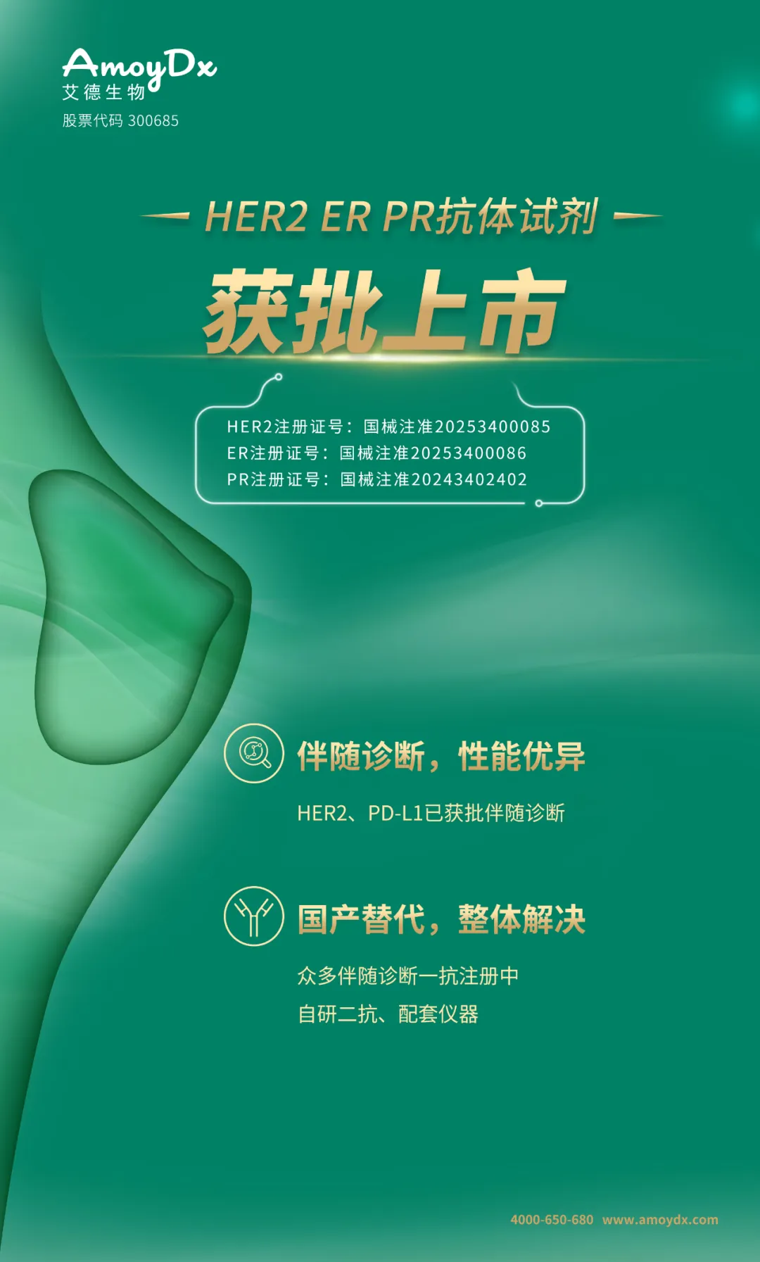 廈門艾德生物醫(yī)藥科技股份有限公司(股票代碼:300685)聚焦在腫瘤精準(zhǔn)醫(yī)療分子診斷領(lǐng)域,專注于科技惠民的技術(shù)創(chuàng)新,致力為患者提供合規(guī)、高品質(zhì)的診斷產(chǎn)品和服務(wù),讓患者從精準(zhǔn)醫(yī)療中真正獲益。公司擁有國家企業(yè)技術(shù)中心、工信部專精特新小巨人企業(yè)、國家級制造業(yè)單項冠軍企業(yè)、博士后科研工作站、發(fā)改委基因檢測技術(shù)應(yīng)用示范中心、國家高新技術(shù)企業(yè)、福建省腫瘤高通量測序工程研究中心等資質(zhì),GMP標(biāo)準(zhǔn)廠房獲得國家藥監(jiān)局(NMPA)和歐盟ISO13485資質(zhì)認(rèn)證;公司擁有ADx-ARMS?、Super-ARMS?、ddCapture?、ADx-HANDLE?等核心技術(shù),核心技術(shù)獲得中國、美國、歐盟、日本授權(quán),榮獲國家科學(xué)技術(shù)進(jìn)步獎二等獎、中國專利獎銀獎;公司產(chǎn)品覆蓋具備精準(zhǔn)醫(yī)療條件的各大癌種,多個產(chǎn)品至今尚無競品,除了在國內(nèi)三甲醫(yī)院大規(guī)模應(yīng)用外,部分產(chǎn)品在日本、韓國獲批上市并進(jìn)入當(dāng)?shù)蒯t(yī)保,開創(chuàng)了我國腫瘤伴隨診斷海外獲批的先例。此外,公司下設(shè)廈門艾德醫(yī)學(xué)檢驗所、上海廈維醫(yī)學(xué)檢驗所,擁有醫(yī)療機構(gòu)執(zhí)業(yè)許可證、通過美國病理學(xué)會(CAP)認(rèn)證和ISO15189認(rèn)可,專業(yè)從事第三方臨檢服務(wù)。目前全球數(shù)十個國家和地區(qū)的客戶選擇了艾德產(chǎn)品和服務(wù),每年有數(shù)十萬腫瘤患者從中受益。此外,公司瞄準(zhǔn)行業(yè)創(chuàng)新源頭,以伴隨診斷賦能原研藥物臨床,是眾多頂級藥企腫瘤藥物開發(fā)的戰(zhàn)略合作伙伴,是國際知名的民族品牌。