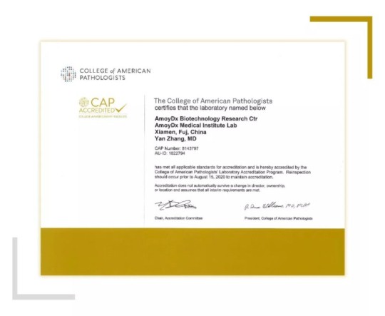 2018年8月15日,廈門艾德醫(yī)學(xué)檢驗(yàn)所接受了國際權(quán)威臨床實(shí)驗(yàn)室質(zhì)量認(rèn)證體系CAP(College of American Pathologists,美國病理家協(xié)會(huì))派遣的資深專家的現(xiàn)場(chǎng)審檢,全技術(shù)平臺(tái)(PCR、FISH、一代測(cè)序、NGS)共計(jì)7個(gè)項(xiàng)目均順利通過CAP項(xiàng)目質(zhì)量體系驗(yàn)收,獲得CAP總部頒發(fā)的CAP認(rèn)證證書。
