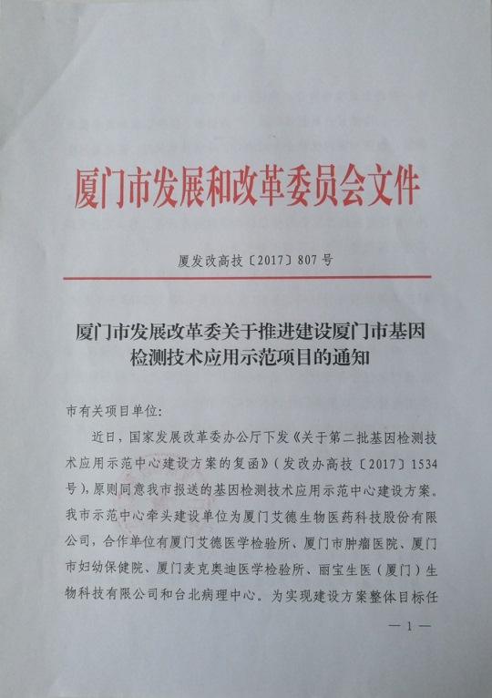 近日,廈門市發(fā)展和改革委員會發(fā)布《廈門市發(fā)展改革委關于推進建設廈門市基因檢測技術應用示范項目的通知》(廈發(fā)改高技[2017]807號),正式批復由廈門艾德生物醫(yī)藥科技股份有限公司牽頭建設,廈門艾德醫(yī)學檢驗所、廈門市腫瘤醫(yī)院、廈門市婦幼保健院等合作共建【廈門市基因檢測技術應用示范項目】。