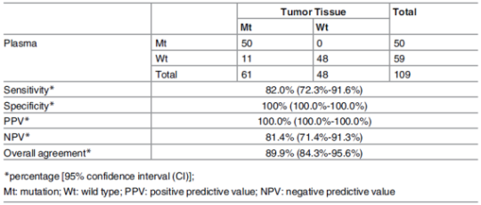 李教授團(tuán)隊(duì)先通過經(jīng)稀釋后的細(xì)胞系DNA濃度梯度驗(yàn)證了ADx-SuperARMS技術(shù)檢測EGFR E19Del、L858R和T790M突變的分析靈敏度達(dá)0.2%、特異性達(dá)100%。隨后,研究團(tuán)隊(duì)又通過臨床檢測數(shù)據(jù)驗(yàn)證了ADx-SuperARMS技術(shù)用于晚期肺腺癌患者血漿ctDNA中EGFR突變檢測的表現(xiàn)。研究共入組109例同時(shí)提供血液及組織配對(duì)標(biāo)本的轉(zhuǎn)移性晚期肺腺癌患者。血漿樣本EGFR突變狀態(tài)采用ADx-SuperARMS EGFR檢測,組織樣本采用ADx-ARMS EGFR檢測。以組織樣本EGFR突變狀態(tài)作為與參考標(biāo)準(zhǔn),評(píng)價(jià)ADx-SuperARMS EGFR檢測的一致性。同時(shí)跟蹤了ADx-SuperARMS EGFR檢測陽性的入組人群接受EGFR-TKIs治療的療效觀察。