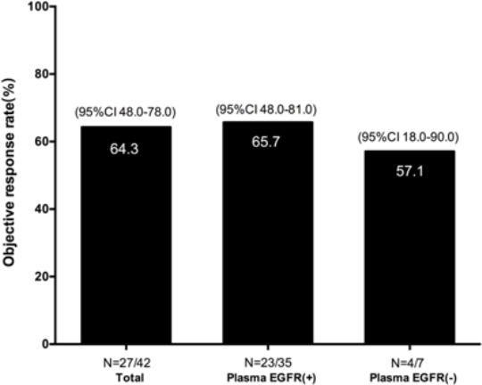 此外,研究團(tuán)隊(duì)還追蹤了42例組織EGFR檢測陽性、腫瘤可評(píng)估且接受了EGFR-TKIs一線治療的入組患者的療效觀察。結(jié)果顯示,27例(64.3%)達(dá)到部分緩解(PR),14例(33.3%)為疾病穩(wěn)定(SD),1例(2.4%)為疾病進(jìn)展(PD);客觀響應(yīng)率(ORR)和疾病控制率(DCR)分別為64.3%和97.6%。其中血漿EGFR檢測陽性且接受EGFR-TKIs一線治療的35例入組患者中,PR 23例(65.7%),SD 11例(31.4%),PD 1例(2.9%);ORR和DCR分別為65.7%和97.1%,與組織陽性人群結(jié)果十分相似,而血漿陰性組織陽性人群的ORR則為57.1%。(4/7)(圖2)。截至統(tǒng)計(jì)日,入組人群的無進(jìn)展生存期(PFS)和總生存期(OS)尚未達(dá)到,繼續(xù)隨訪觀察。