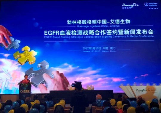 中國廈門,2017年1月10日 - 總部位于廈門的腫瘤精準(zhǔn)檢測領(lǐng)域優(yōu)勢企業(yè)艾德生物與全球先進(jìn)的制藥公司勃林格殷格翰今日共同宣布:雙方簽署了一項(xiàng)合作協(xié)議,啟動艾德生物-勃林格殷格翰肺癌EGFR突變血液檢測項(xiàng)目。該項(xiàng)目將致力于非小細(xì)胞肺癌EGFR突變血液檢測在中國大陸的推廣,實(shí)現(xiàn)一管血檢測非小細(xì)胞肺癌患者EGFR基因突變狀態(tài),讓更多非小細(xì)胞肺癌患者都有機(jī)會從EGFR靶向藥物治療中受益。肺癌血液EGFR突變檢測項(xiàng)目中將采用艾德生物新創(chuàng)的、專門為血液基因突變檢測而開發(fā)的高敏感檢測技術(shù)ADx-Super-ARMS®。