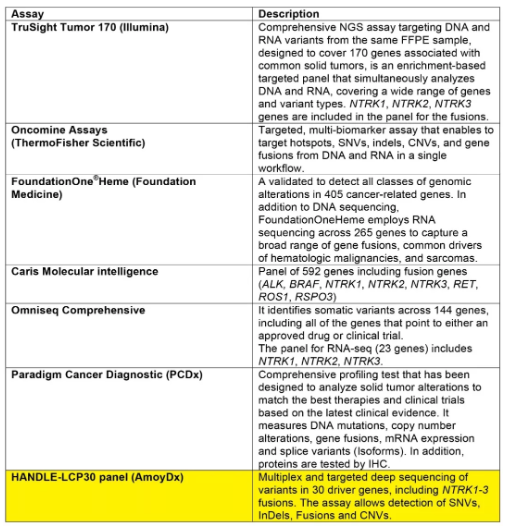 近期,歐洲腫瘤內(nèi)科學(xué)會(ESMO)在線發(fā)表NTRK基因融合檢測標(biāo)準(zhǔn)方法相關(guān)共識,將艾德生物AmoyDx® HANDLE Classic NGS Panel(供應(yīng)海外市場,以下簡稱LCP-30 Panel)作為NTRK融合檢測的推薦NGS產(chǎn)品之一。