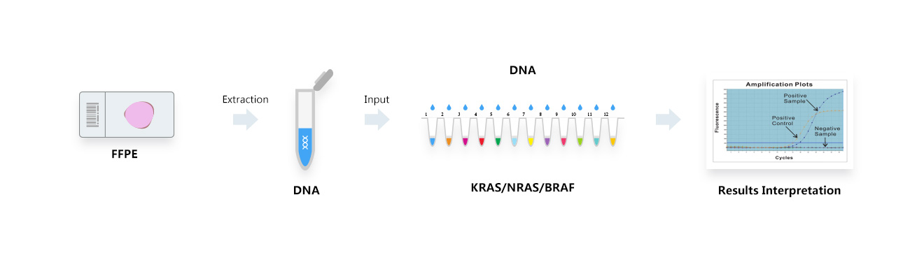 本試劑盒用于檢測人類KRAS基因第2、3、4外顯子熱點突變,人類NRAS基因第2、3、4外顯子熱點突變和人類BRAF基因第15號外顯子熱點突變。試劑盒以DNA為檢測樣本,提供突變狀態(tài)的定性評估,為臨床醫(yī)生對結直腸癌患者選擇腫瘤靶向藥物治療提供依據(jù)。